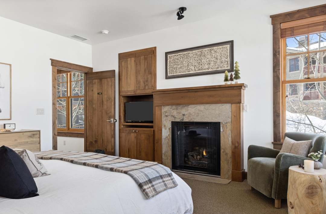 A sophisticated primary bedroom suite with mountain lodge character, featuring warm natural wood millwork throughout, a prominent fireplace with stone surround, and abundant natural light from large framed windows. The transitional design blends traditional architectural details like crown molding with modern furnishings and a serene color palette of whites, warm woods, and soft sage accents, creating a luxurious yet inviting retreat.