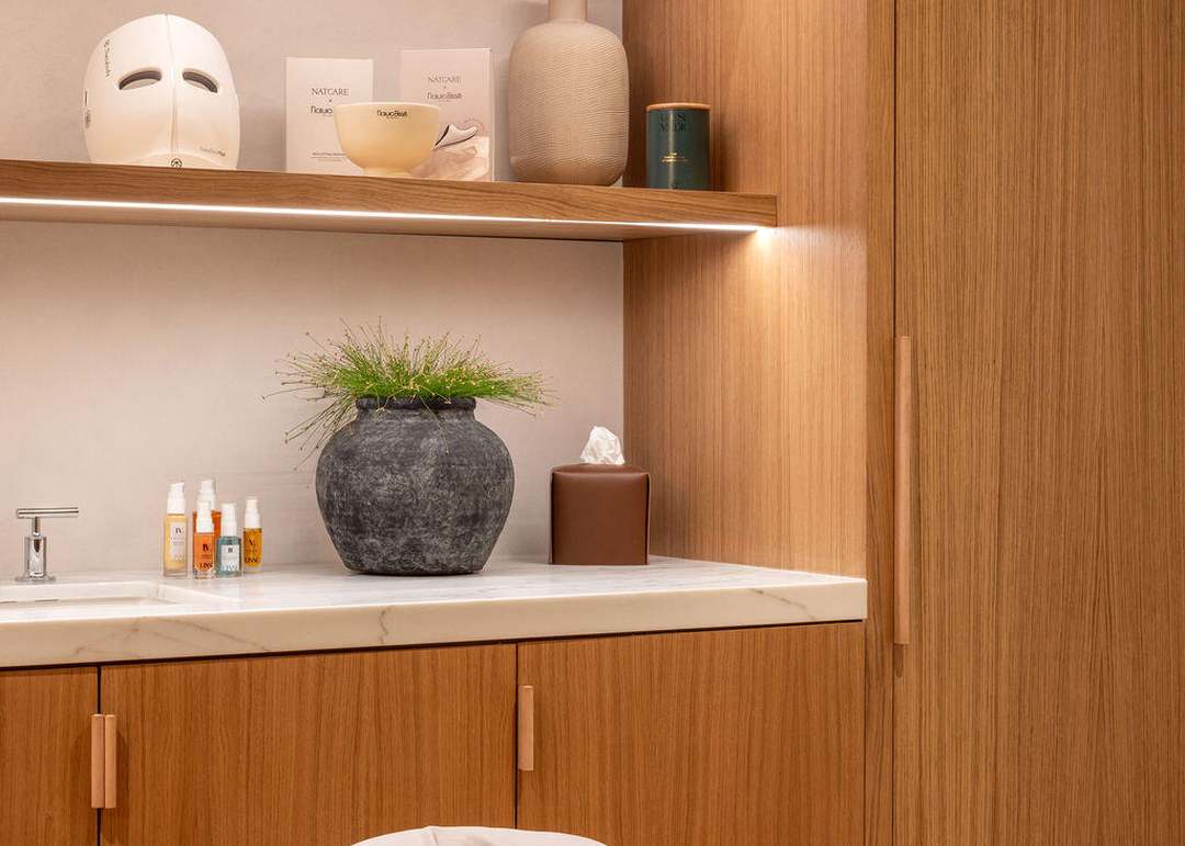 A refined primary bathroom featuring a floating marble vanity set against warm natural wood cabinetry and cream walls, accented by curated lifestyle accessories and a sculptural textured planter. The space balances organic materials with contemporary minimalism, enhanced by warm under-cabinet lighting and brass hardware, creating an serene, spa-like retreat.