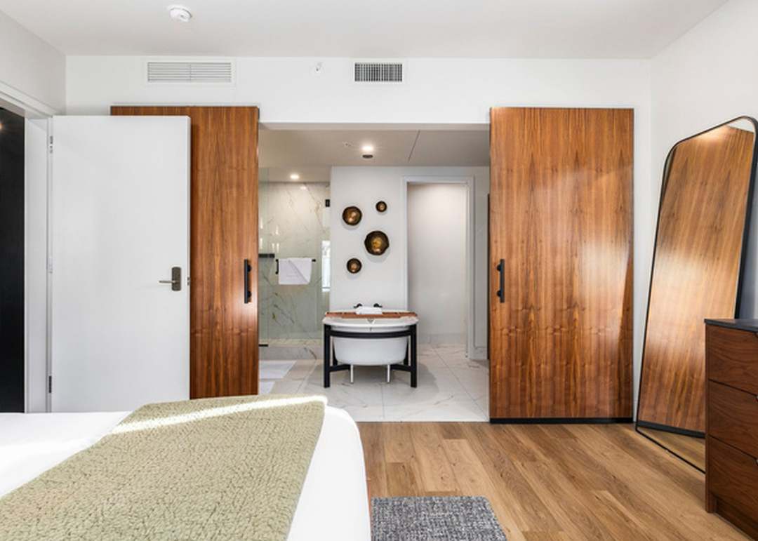 An exceptionally well-designed primary bedroom-bathroom suite featuring warm walnut wood double doors, hardwood flooring, and a spa-like ensuite with a freestanding soaking tub and frameless glass walk-in shower with large-format tile. The sophisticated palette of whites, warm wood tones, and gold accents creates a serene, luxurious retreat with elegant custom millwork throughout.