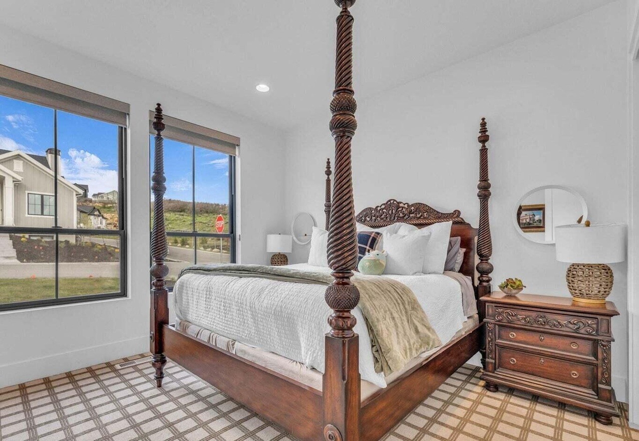 A sophisticated primary bedroom featuring an ornately carved four-poster bed with richly turned spindles, paired with elegant traditional furnishings and a geometric patterned tile floor. Abundant natural light floods through floor-to-ceiling windows overlooking pastoral mountain views, creating a warm, luxurious retreat that balances classical design details with contemporary comfort.