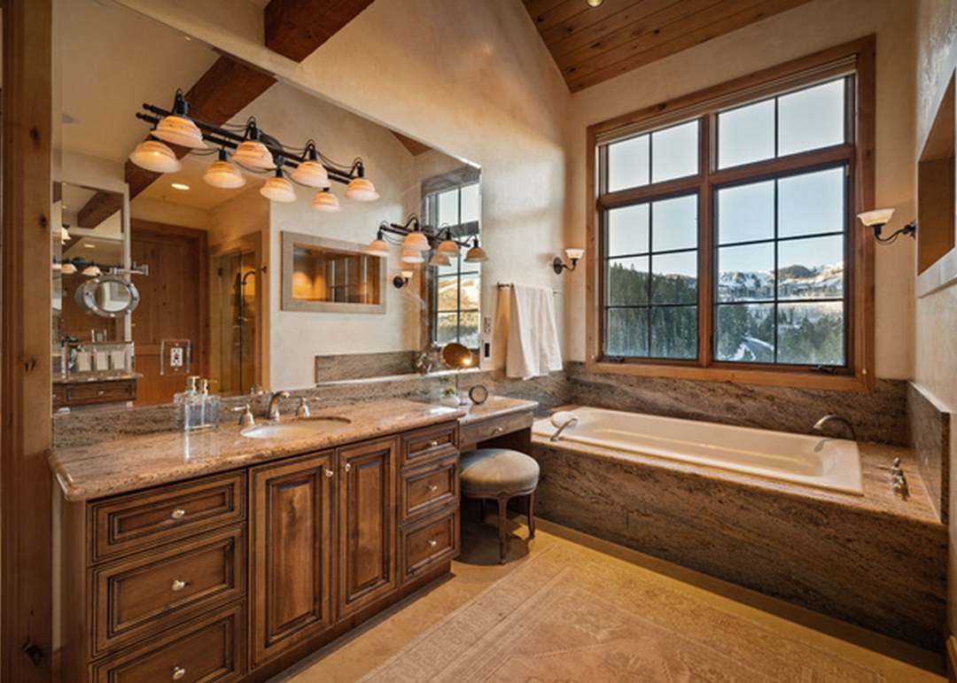 A stunning mountain-view primary bathroom combining transitional elegance with organic materials, featuring a spa-like soaking tub positioned to capture expansive alpine vistas through oversized windows, paired with custom dark wood cabinetry, granite countertops, and dramatic statement lighting beneath soaring exposed beam ceilings.