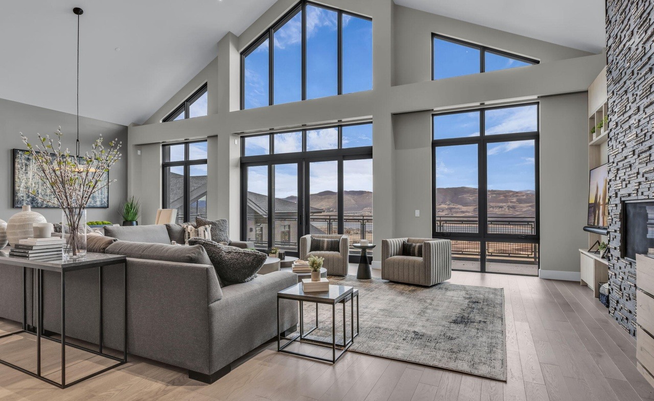 A stunning mountain-view living room featuring dramatic vaulted ceilings, expansive floor-to-ceiling windows framing desert landscape, and a sophisticated palette of warm neutrals paired with textured stone and black metal accents. The space exemplifies organic modern design with its blend of natural materials, abundant natural light, and understated luxury furnishings that emphasize serene elegance and indoor-outdoor connection.