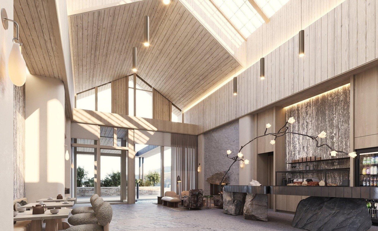A sophisticated mountain-modern spa-inspired entryway featuring soaring vaulted wood-paneled ceilings with skylights, warm stone flooring, and sculptural boulders that evoke a zen sanctuary. The space seamlessly blends organic natural materials—raw stone, warm wood, and artistic branch installations—with minimalist furnishings and warm ambient lighting to create an ethereal, peaceful threshold into luxury living.
