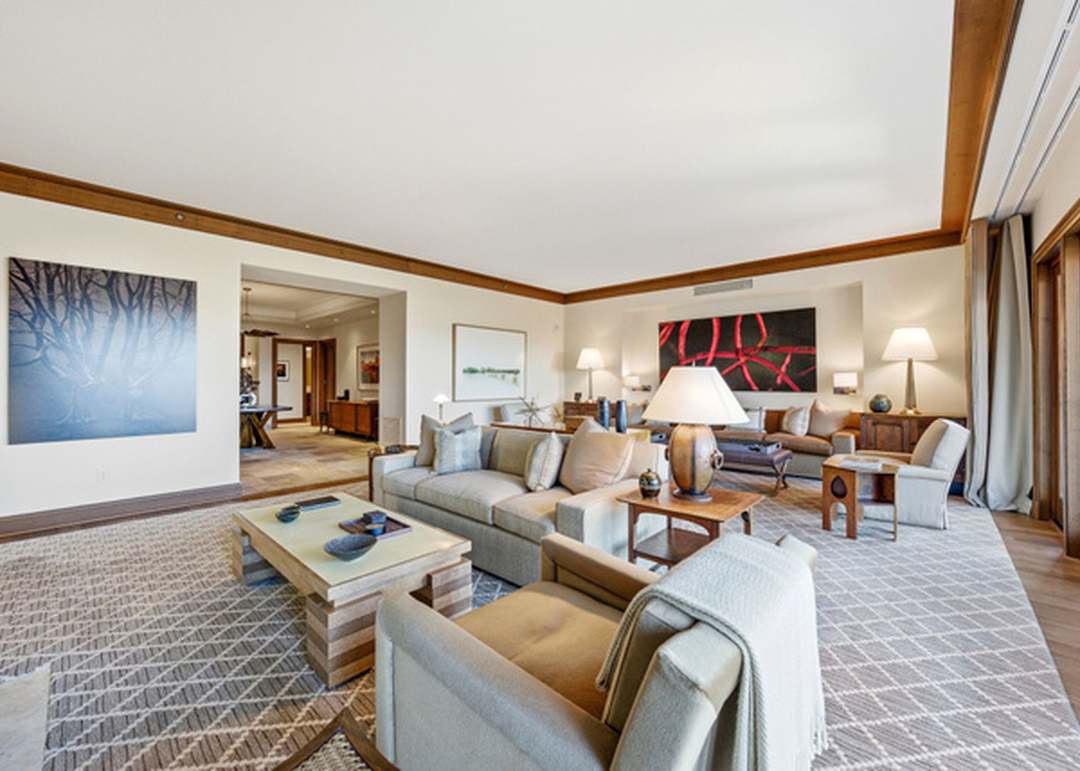 A sophisticated multi-zone living suite featuring exposed walnut beams, soft neutral upholstery in cream and beige, and layered lighting that creates an atmosphere of refined elegance. The space exemplifies transitional luxury with traditional architectural details—crown molding, beamed ceilings, rich wood tones—combined with contemporary furnishings and a warm, inviting material palette of natural linens, wood, and subtle brass accents.