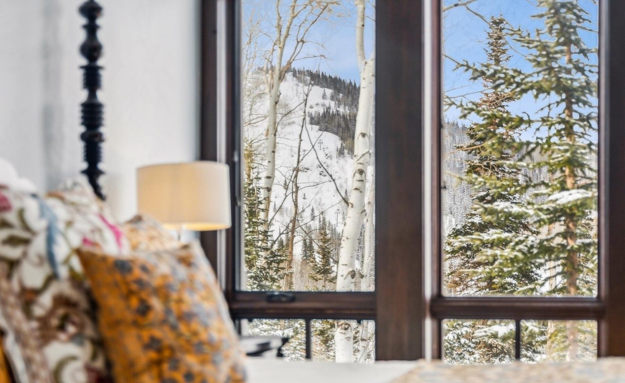 A serene mountain-view primary bedroom showcasing mountain modern design with expansive floor-to-ceiling windows framing snow-capped peaks and evergreen forests. The warm, neutral palette is anchored by a patterned accent chair and soft gold pendant lighting, creating an inviting retreat that seamlessly merges interior comfort with dramatic alpine scenery.