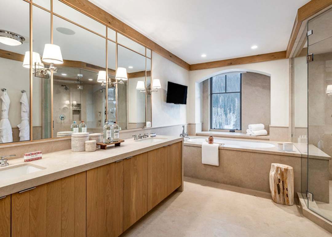 Countertop: QuartzCabinets: Natural WoodCabinet Color: Light WoodFlooring: StoneCeiling: BeamedVanity: Double SinkShower: Frameless GlassTub: Built InTile: Large Format