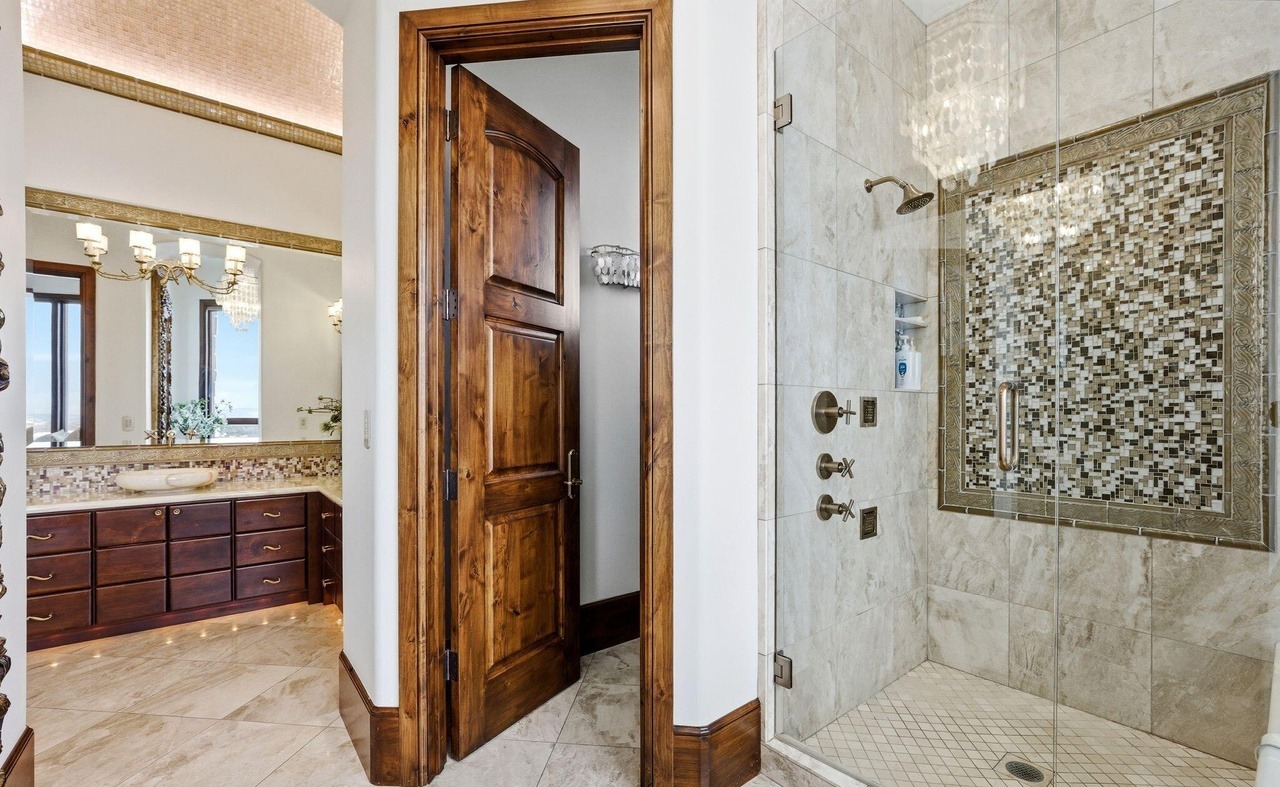 Double VanityWalk In ShowerFrameless Glass EnclosureMarble SurroundCrown MoldingStatement LightingHigh Ceilings