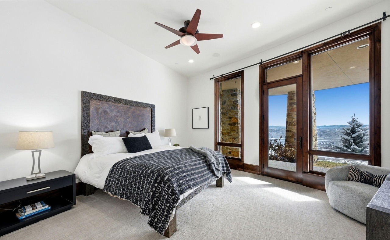 A sophisticated mountain retreat primary bedroom featuring floor-to-ceiling glass doors framing expansive valley views, anchored by a textured stone accent wall and statement dark wood headboard. The space balances serene minimalism with organic warmth through natural materials, soft neutral palette, and excellent natural light that showcases the panoramic landscape as the room's primary focal point.