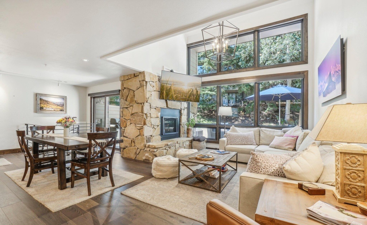 A sophisticated open-concept living and dining space anchored by a striking stacked stone fireplace, featuring abundant natural light from floor-to-ceiling windows, vaulted ceilings, and a carefully curated blend of warm wood furnishings with neutral upholstery. The room exemplifies transitional design with traditional architectural elements elevated by modern clean-lined furniture and warm earth-tone materials.