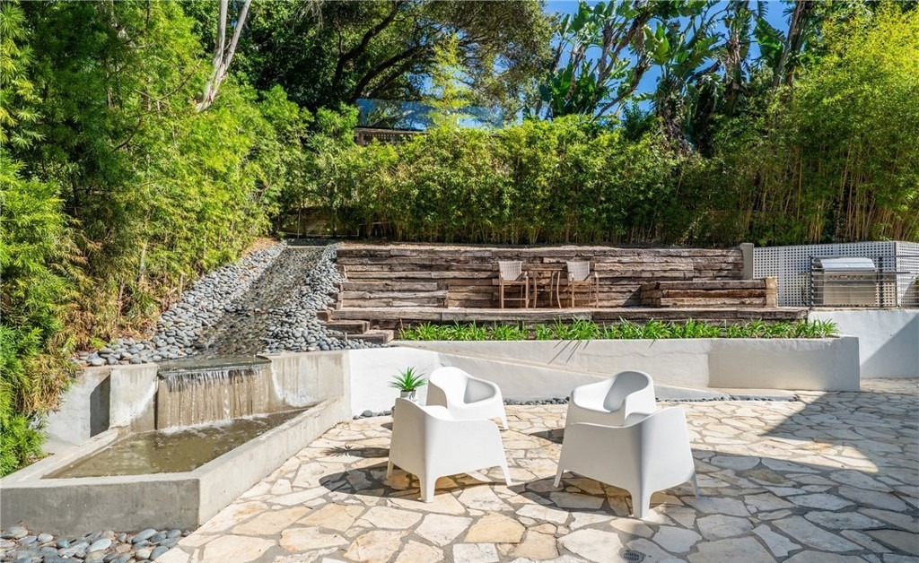A sophisticated modern patio featuring clean-lined concrete retaining walls, warm-toned stone flooring, and minimalist white furniture positioned for contemplative seating. The space integrates a small water feature with natural landscaping and gravel pathways, creating a serene outdoor retreat with desert-modern sensibilities and high-end contemporary design.