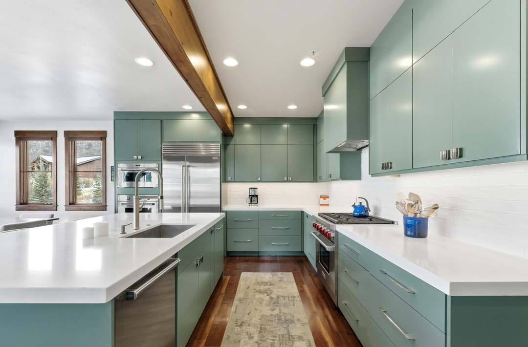 A sophisticated galley kitchen featuring soft sage-green cabinetry paired with white quartz countertops and subway tile backsplash, anchored by a striking wooden beam that adds warmth and architectural interest. The space balances contemporary clean-line design with organic materials and a curated color palette, creating a serene yet luxurious cooking environment with abundant natural light and high-end stainless steel appliances.