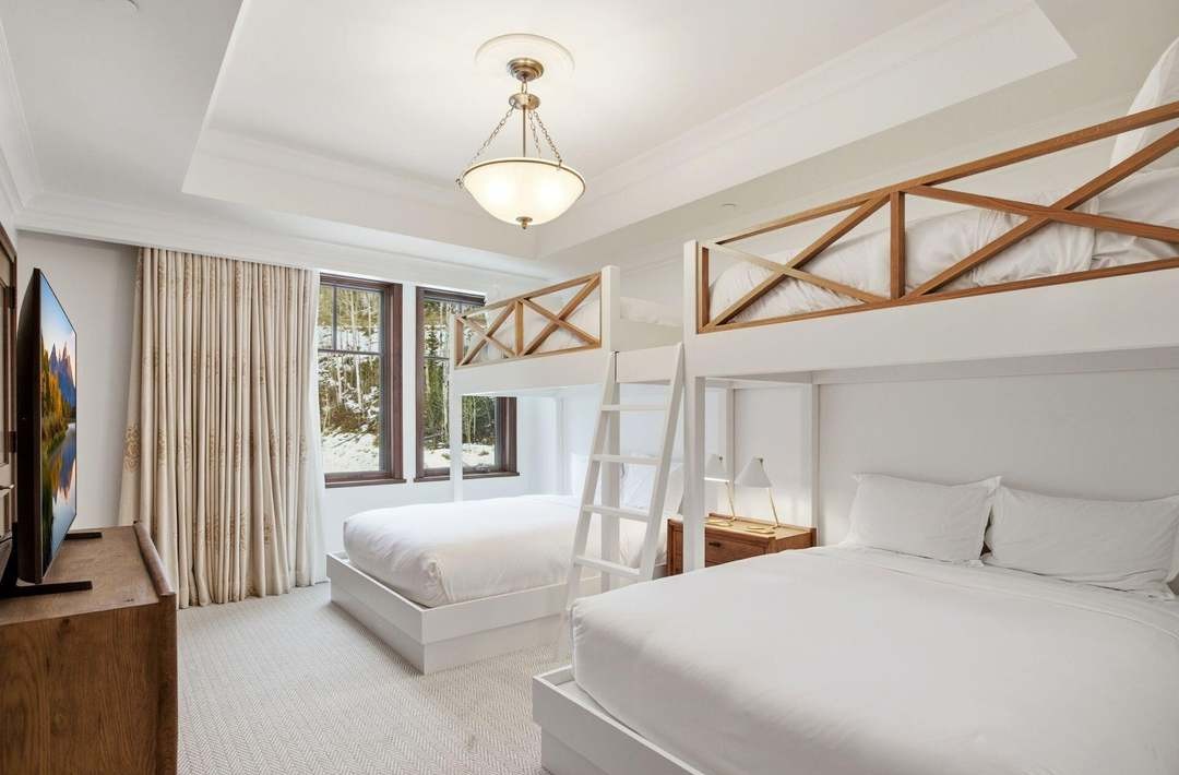 A sophisticated multi-bed guest suite featuring custom-built loft and bunk beds with decorative wooden X-bracing and a coffered ceiling, bathed in abundant natural light from oversized windows. The serene palette of whites and creams accented by warm wood tones and brass fixtures creates an airy yet luxurious resort-like atmosphere ideal for families or multiple guests.