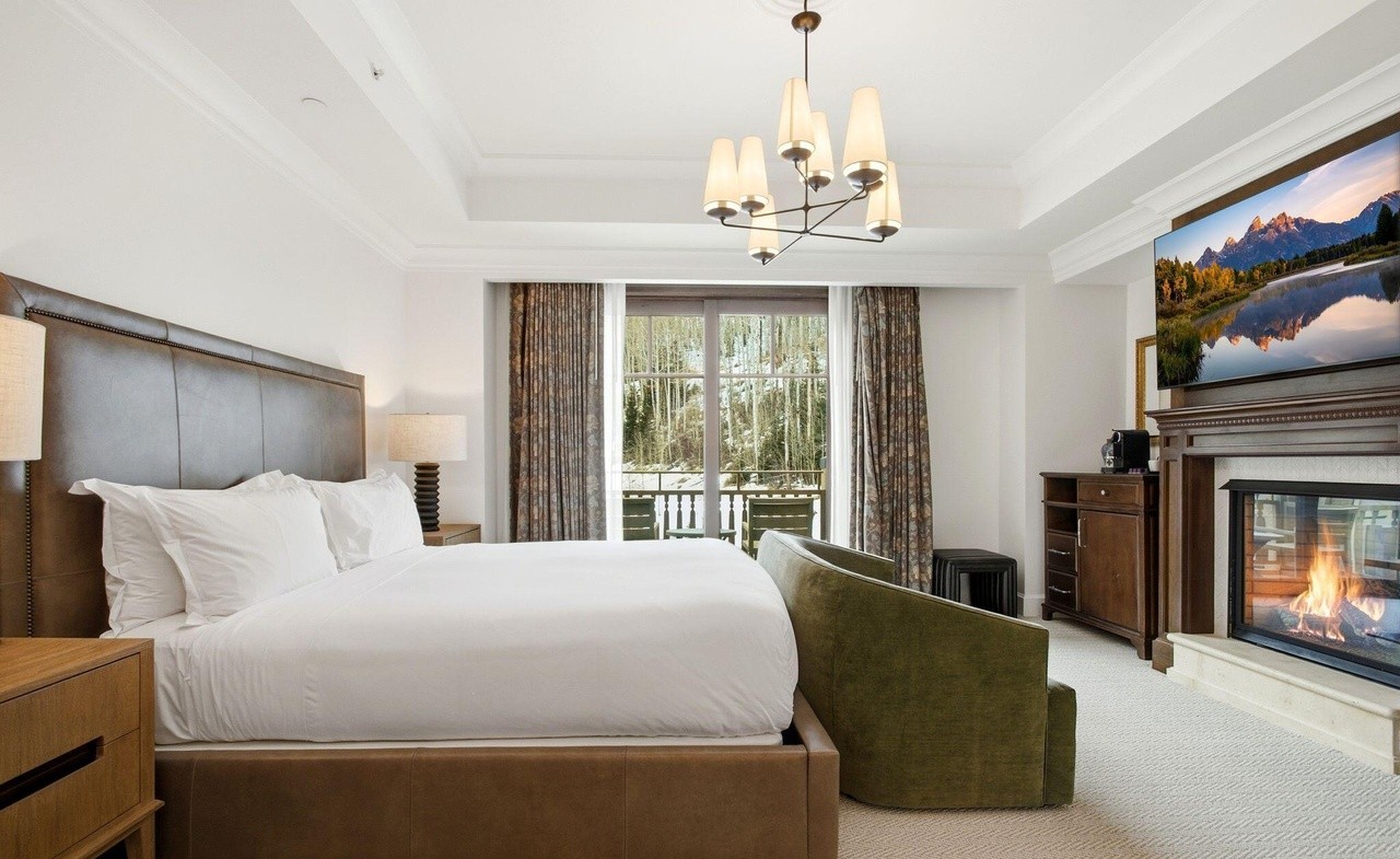 A stunning mountain resort-style primary bedroom suite featuring a coffered ceiling, gas fireplace, and expansive floor-to-ceiling windows framing alpine vistas. The space masterfully blends warm traditional architectural elements with contemporary furnishings, organic materials, and a sophisticated neutral palette accented by olive green upholstery and brass hardware.