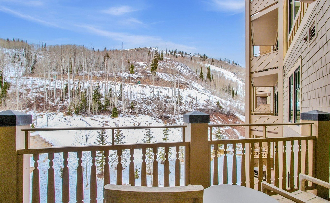 A sophisticated mountain-view patio featuring clean modern railings and stone pavers, overlooking snow-covered peaks and aspen forests. The space exemplifies mountain modern luxury with its marriage of contemporary materials and breathtaking alpine scenery, creating a serene and dramatic outdoor living experience.