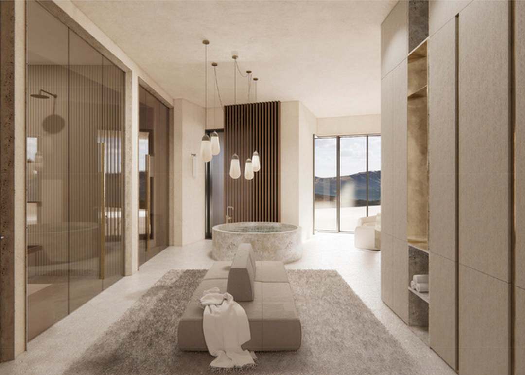 A spa-like primary bathroom featuring a stunning freestanding marble soaking tub as the centerpiece, paired with a seamless frameless glass walk-in shower and expansive windows framing mountain views. The design masterfully balances minimalist restraint with organic warmth through soft neutral tones, high-quality marble materials, bronze fixtures, and curated pendant lighting that creates a serene, luxurious retreat.