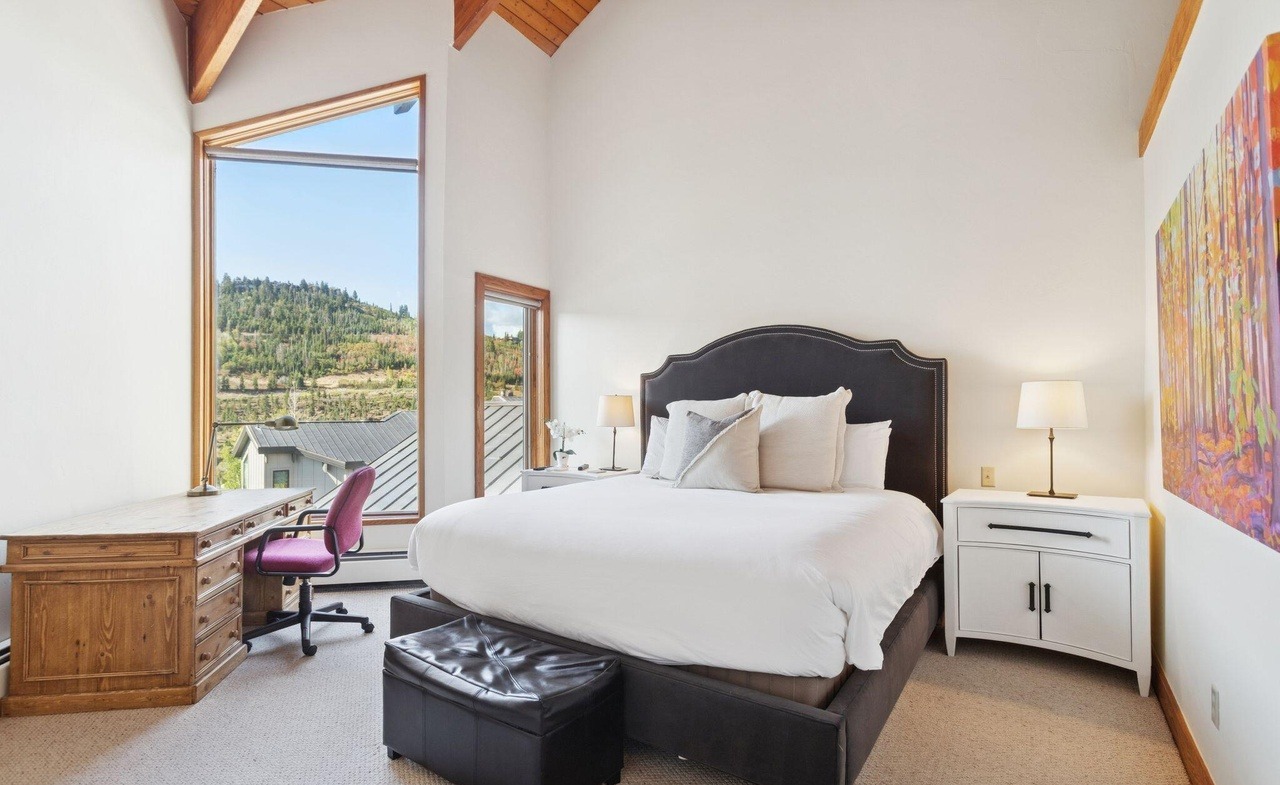A stunning mountain-view primary bedroom featuring dramatic vaulted ceilings with exposed wood beams, floor-to-ceiling windows framing pristine forest and valley vistas, and a sophisticated palette of warm whites, blacks, and naturals. The room balances modern minimalism with organic materials and warm lighting, creating a serene luxury retreat with integrated work space and gallery-quality artwork.