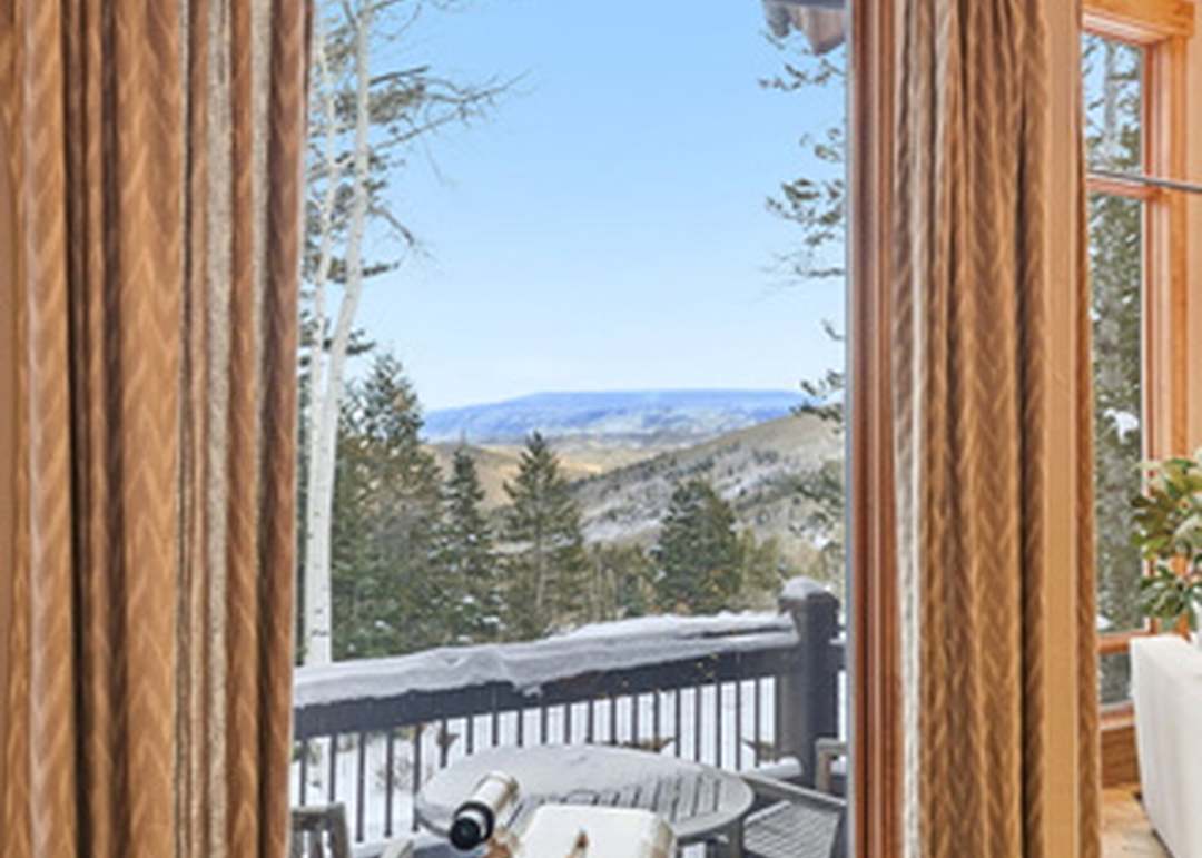 A stunning mountain patio framed by warm wood trim and neutral curtains, featuring unobstructed panoramic views of forested valleys and distant peaks under clear blue sky. The elevated deck with white railings and minimalist furnishings creates an sophisticated outdoor retreat that seamlessly merges contemporary design with the natural alpine landscape.