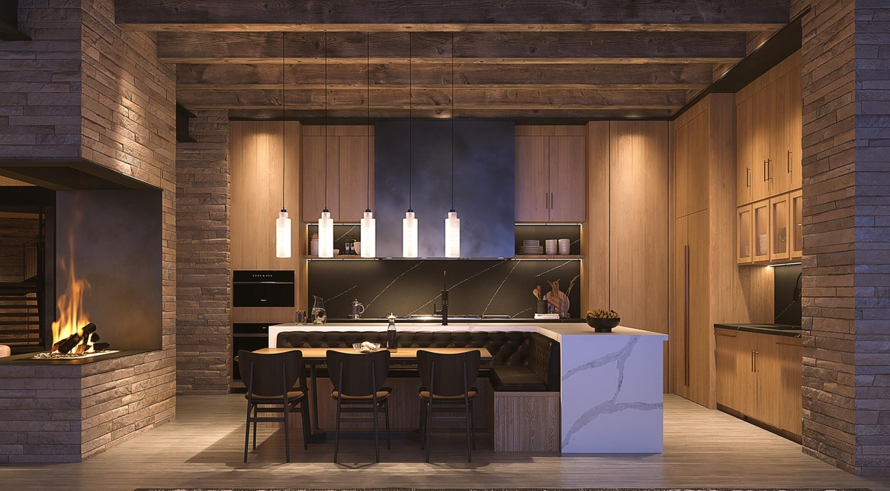 A sophisticated open-concept kitchen featuring dramatic exposed timber beams and brick walls that anchor an organic modern aesthetic, complemented by warm natural wood cabinetry, sculptural marble waterfall island, and statement pendant lighting. The space seamlessly integrates a luxury fireplace and integrated appliances, creating a high-end mountain retreat aesthetic with warm, inviting character.