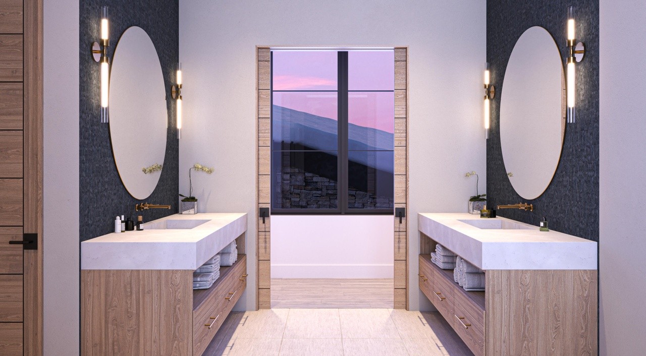 Double VanityFloating VanityFrameless Glass ShowerStatement LightingRound MirrorsSconce LightingFloor To Ceiling WindowOpen Shelf StorageAccent Wall