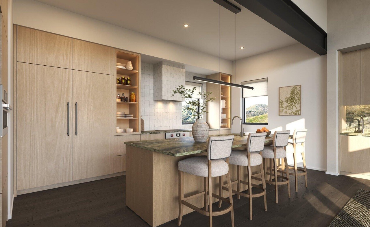 A beautifully composed modern kitchen featuring a dramatic waterfall-edge quartzite island, light natural wood cabinetry with black hardware, and an open-concept layout bathed in natural light. The space balances warmth and contemporary elegance through thoughtful material layering—subway tile backsplash, built-in shelving, and soft furnishings—creating a sophisticated yet livable luxury aesthetic.