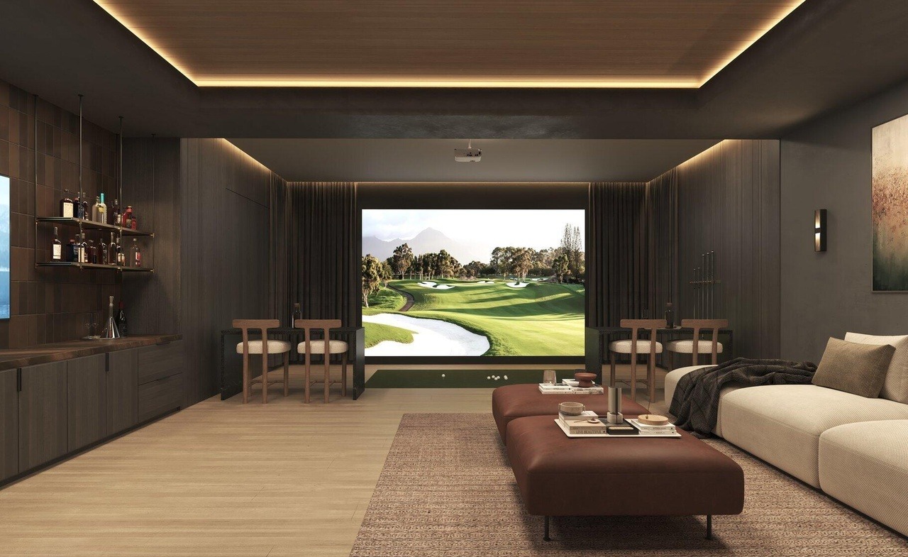 An exceptionally refined home theater space featuring a golf course display framed by floor-to-ceiling dark curtains, with warm-toned recessed ceiling lighting, custom dark wood cabinetry with integrated bar service on the left, and a sophisticated material palette of charcoal walls, cream upholstered seating, and natural hardwood flooring that creates an intimate yet luxurious viewing environment.