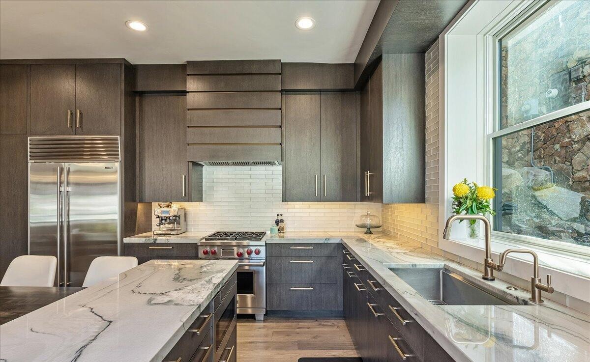 Waterfall IslandPot FillerRange HoodRecessed LightingUnder Cabinet LightingFloor To Ceiling WindowsCustom MillworkDouble IslandOpen Concept