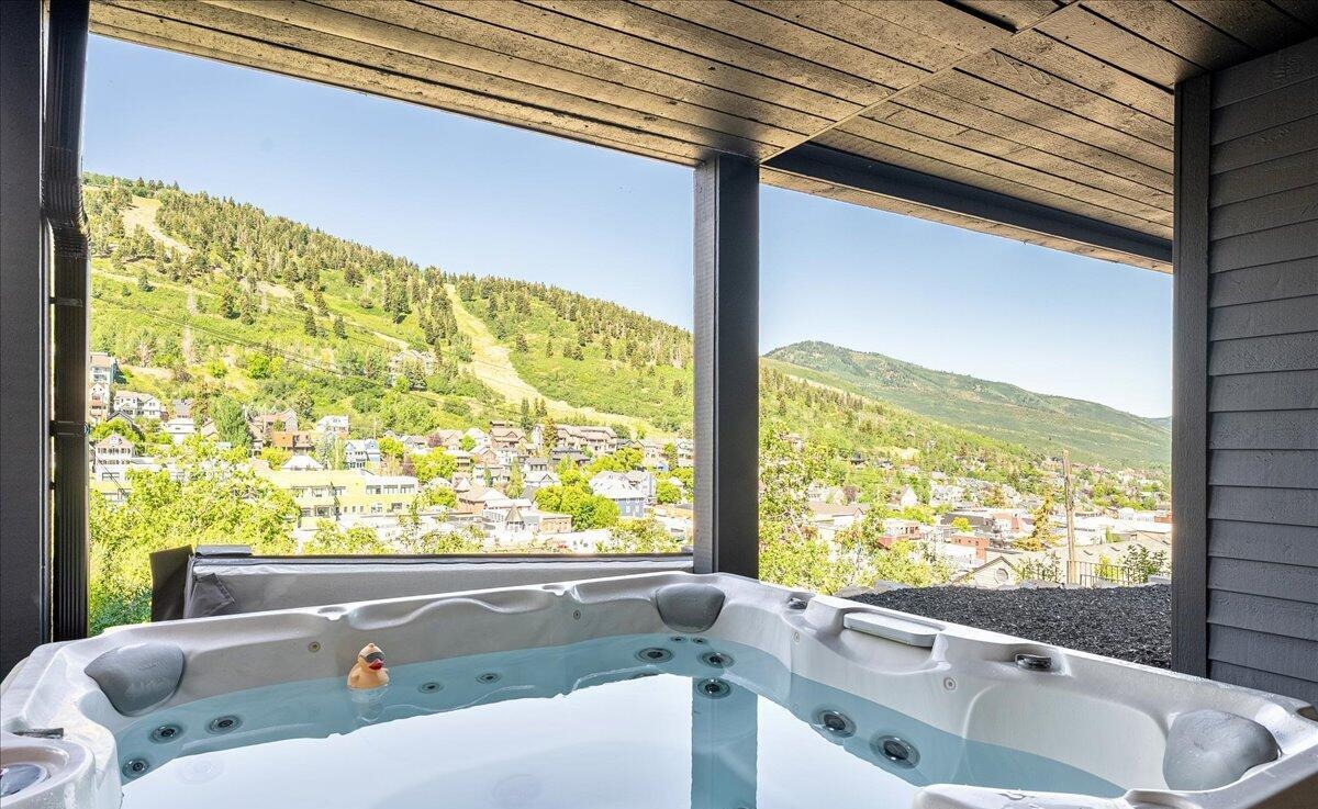 A stunning mountain-view hot tub sanctuary featuring a modern soaking spa with jet therapy positioned on a covered concrete patio with dramatic timber ceiling slats and floor-to-ceiling panoramic windows. The design seamlessly integrates luxury spa amenities with organic modernism, overlooking a lush forested alpine valley community below, creating an exceptional indoor-outdoor wellness retreat.