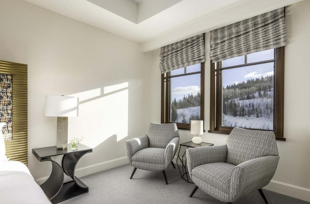 A serene library lounge with sophisticated transitional design, featuring paired gray striped armchairs and an elegant tray ceiling that floods the space with natural light from expansive mountain-view windows. The neutral palette, custom window treatments, and carefully curated furnishings create a refined retreat that balances modern comfort with timeless elegance.