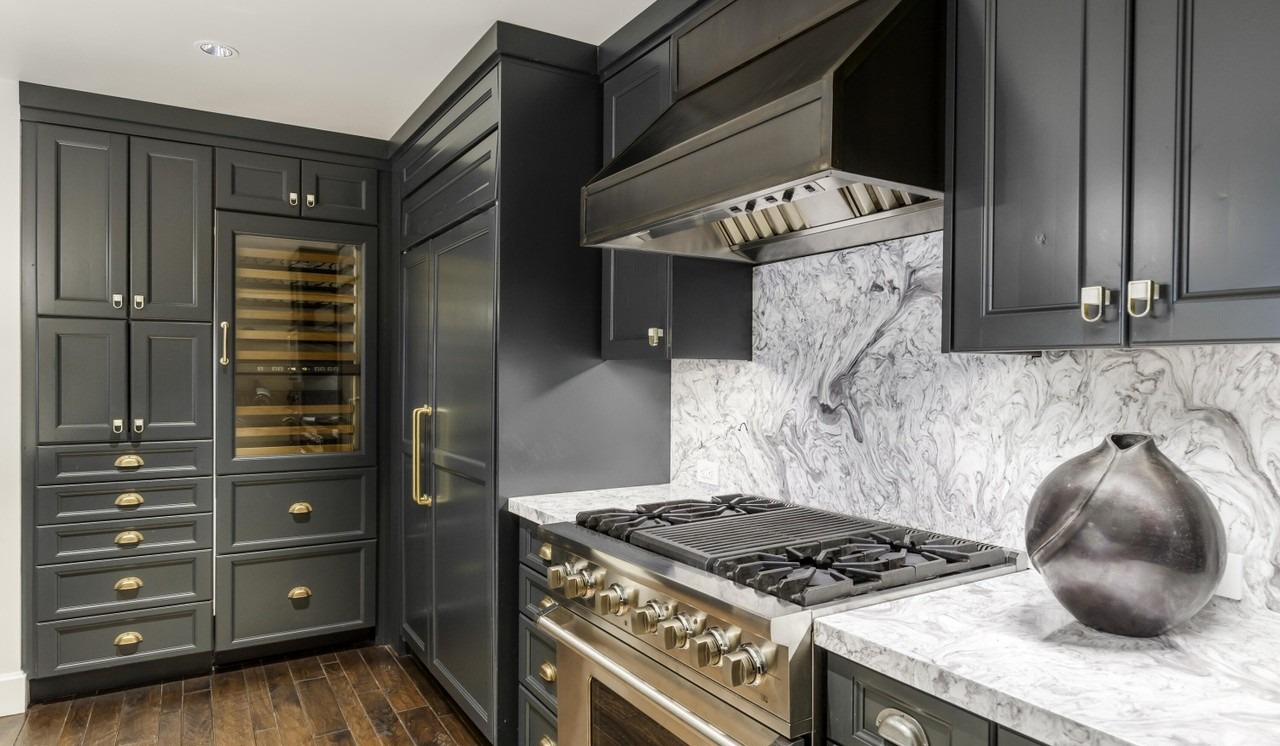 A striking contemporary luxury kitchen featuring jet-black painted cabinetry with geometric paneling and brass hardware, paired with sculptural white marble countertops and a dramatic veined marble backsplash. The sophisticated palette of black, white, and marble is elevated by polished brass accents, professional-grade stainless steel appliances, and custom millwork, creating a high-glamour yet refined aesthetic that balances dramatic color with elegant material choices.