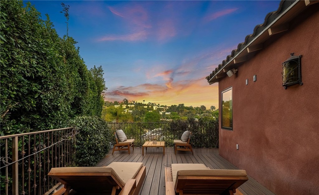 A sophisticated hillside patio featuring warm terracotta stucco walls, composite decking, and mid-century-inspired wooden lounge seating with a commanding panoramic view of the surrounding landscape at golden hour. The space exemplifies organic modern design with natural materials, soft furnishings, and seamless indoor-outdoor living enhanced by strategic landscaping and architectural detailing.