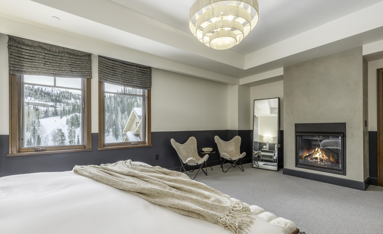 A stunning mountain resort primary bedroom suite featuring a striking two-tone color scheme with gray wainscoting and cream upper walls, accented by a dramatic black fireplace and expansive windows framing snowy alpine views. The sophisticated design combines transitional molding details with modern furnishings and a modern fireplace, enhanced by a layered chandelier and tray ceiling that amplify the sense of luxury and scale.