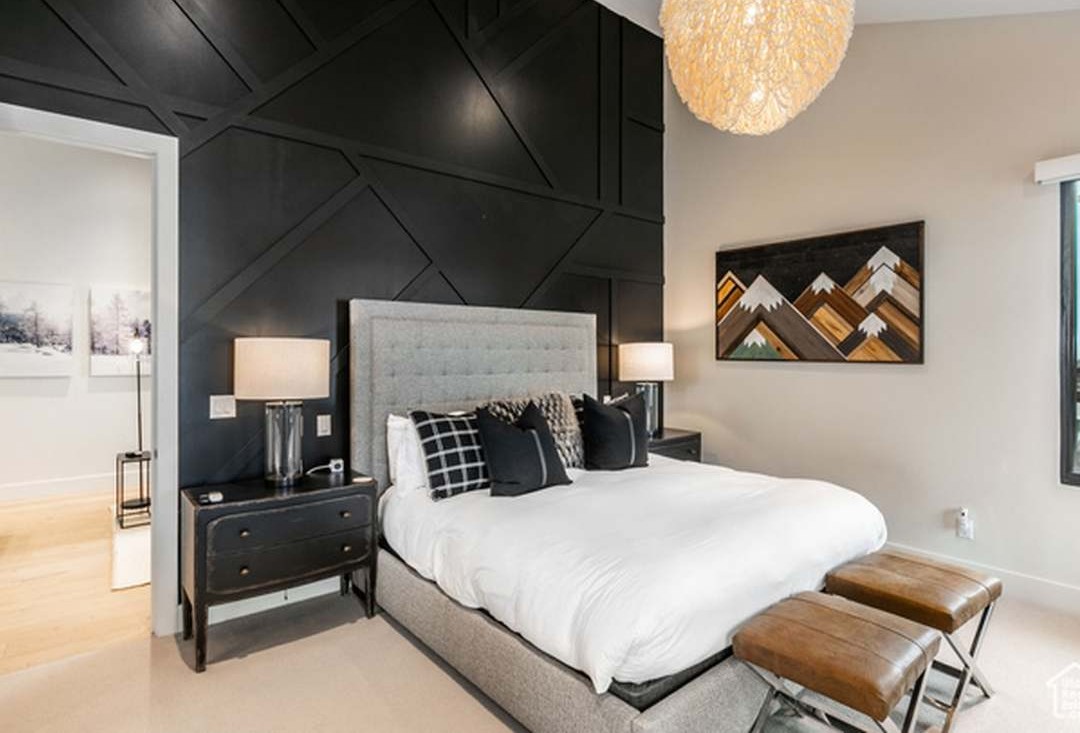 A sophisticated primary bedroom features a dramatic black geometric accent wall with angular paneling that anchors an upholstered gray headboard, paired with refined modernist furnishings and warm layered lighting. The neutral palette and high-end material selections create an intimate yet luxurious retreat with distinctive architectural personality.