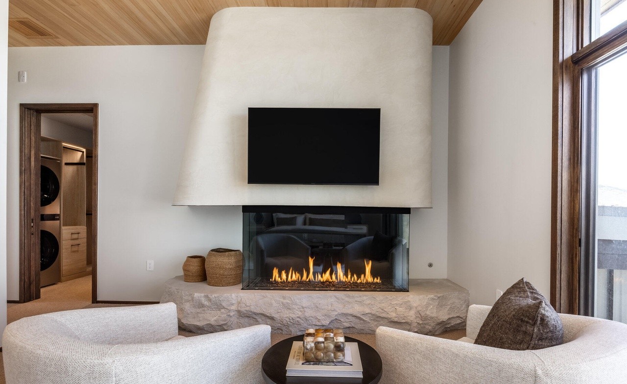 A sophisticated living room anchored by a dramatic curved accent wall and linear gas fireplace with stone surround, combining organic modern warmth with transitional architectural details. The space balances minimalist furniture and natural materials with abundant natural light and a wood-plank ceiling, creating a serene, contemporary luxury retreat.
