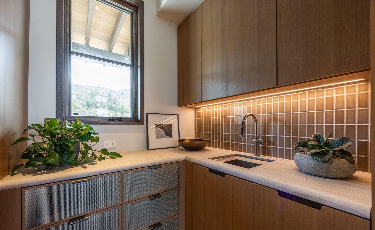 Under Cabinet LightingPendant LightingMinimal StylingPotted PlantsStatement BacksplashClean LinesCustom Millwork