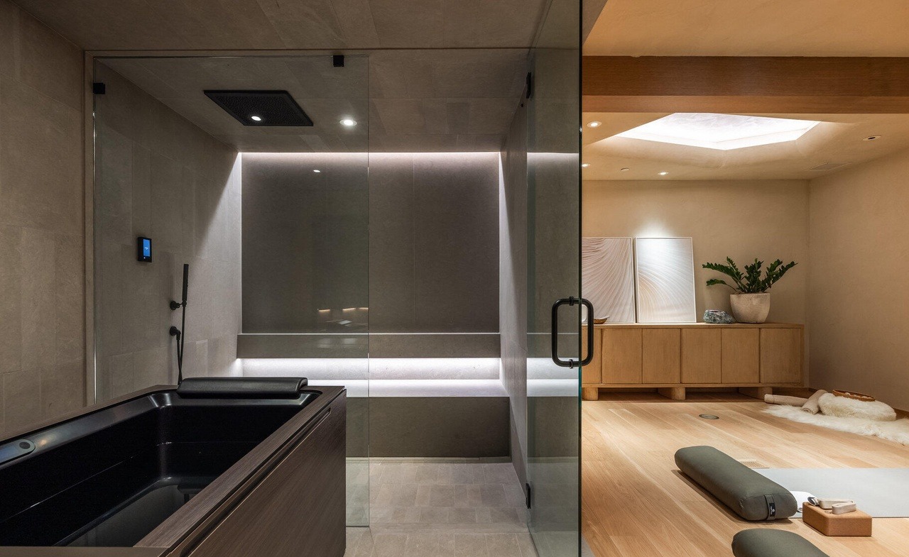 A sophisticated spa-like primary bathroom that seamlessly blends organic modern and japandi aesthetics, featuring a sculptural black freestanding soaking tub paired with a minimalist walk-in shower behind frameless glass. The space is elevated by abundant natural light from a large skylight, warm wood cabinetry with black hardware, large-format tile surfaces, and a carefully curated landscape of natural elements including potted plants and natural textures, creating a serene wellness retreat within the home.