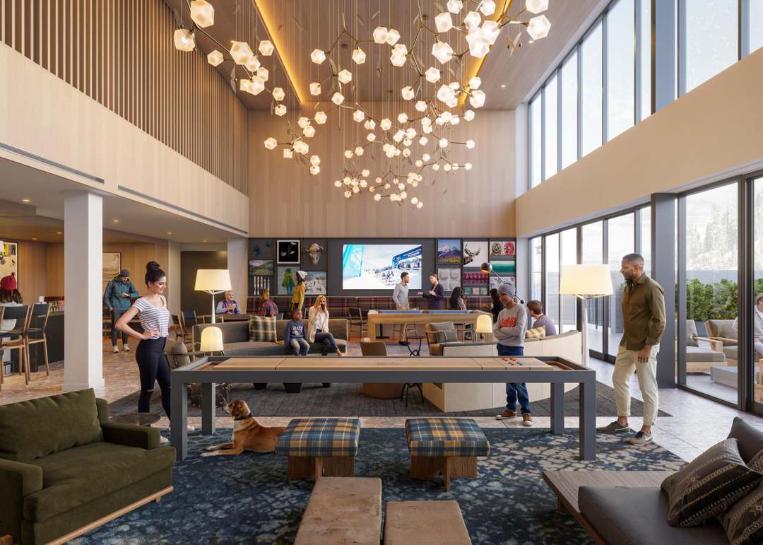A sophisticated great room featuring dramatic soaring ceilings, floor-to-ceiling windows flooding the space with natural light, and an elegant sculptural chandelier anchoring the double-height volume. The warm palette of natural wood, plaid upholstery, and cream furnishings creates a refined yet inviting atmosphere balanced by contemporary metal accents and a modern aesthetic—ideal for a luxury mountain or resort community.
