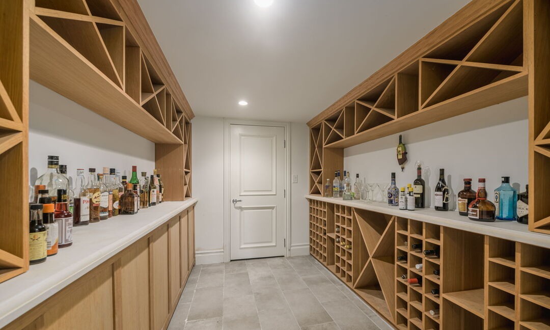 A sophisticated residential wine cellar featuring symmetrical natural oak shelving with distinctive X-pattern accents flanking white quartz countertops lined with curated spirits bottles. The galley layout with recessed lighting and stone tile flooring creates an organized, gallery-like environment that balances functional wine storage with refined aesthetic appeal.