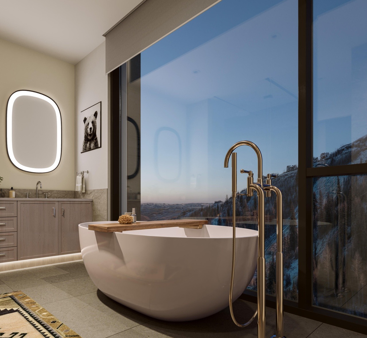 A spectacular ultra-luxury primary bathroom showcasing a sculptural white freestanding soaking tub positioned to capture panoramic mountain and landscape views through expansive floor-to-ceiling windows. The refined organic modern design balances minimalist aesthetics with warm natural materials—light wood cabinetry, brass fixtures, and a floating marble vanity—creating an serene spa-like sanctuary with architectural drama and museum-quality finishes.