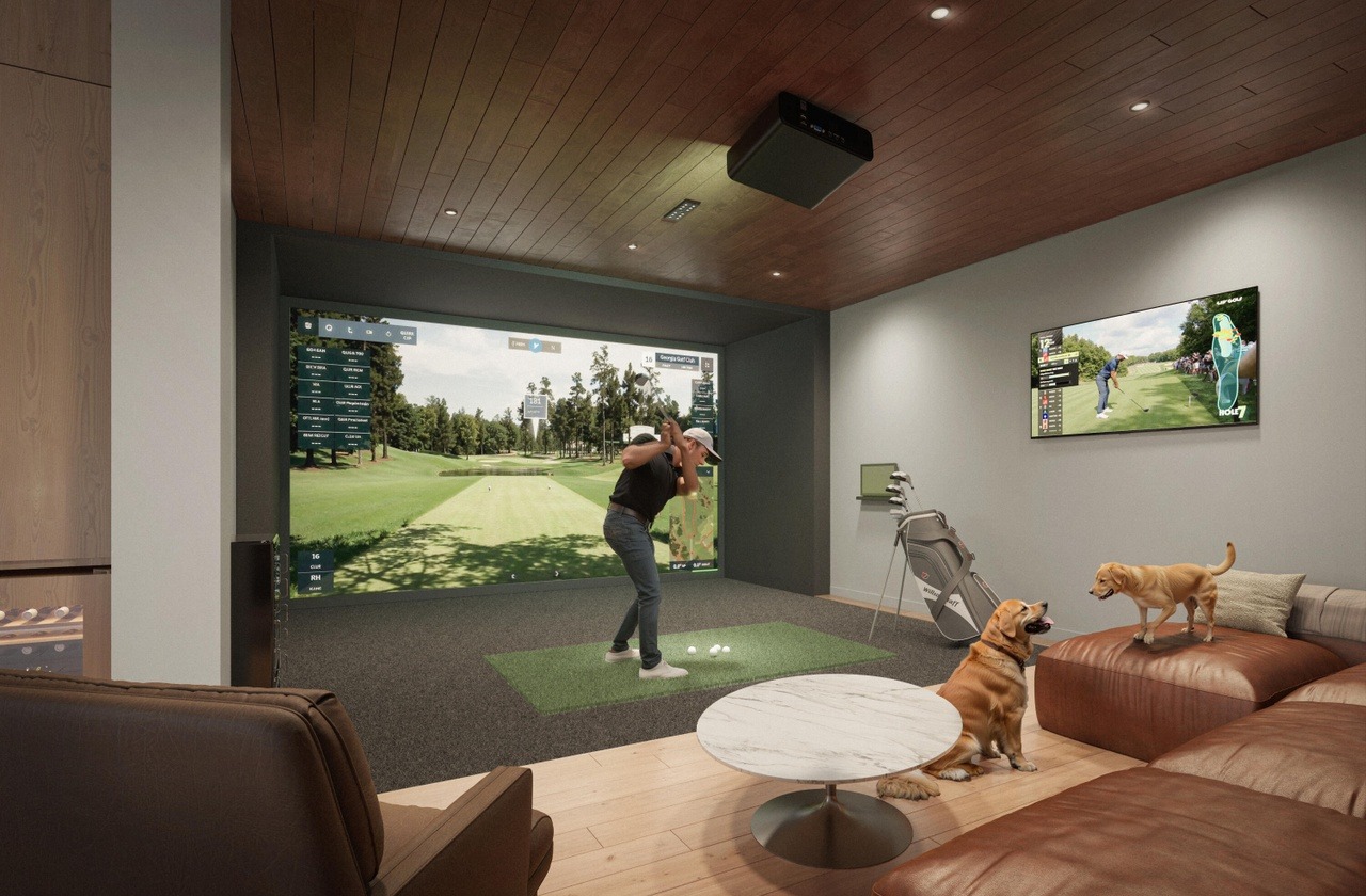 A sophisticated indoor golf simulation and entertainment space featuring a full-swing golf simulator with large projection screen, premium leather sectional seating, and a warm contemporary aesthetic enhanced by warm wood plank ceiling and stone accents. The room seamlessly blends luxury recreation with refined interior design, creating an inviting high-end leisure environment.