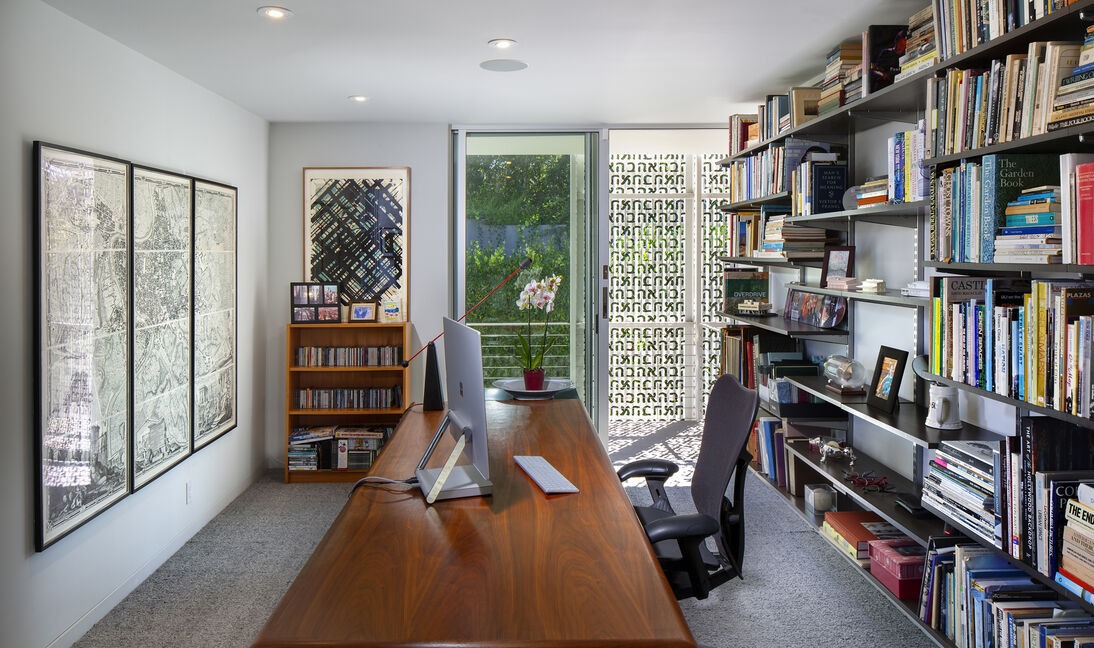 A sophisticated home office featuring custom built-in shelving, a substantial walnut desk, and abundant natural light from expansive windows overlooking greenery. The design balances warm wood tones with cool neutrals and refined furnishings, creating an intellectually stimulating yet serene workspace.