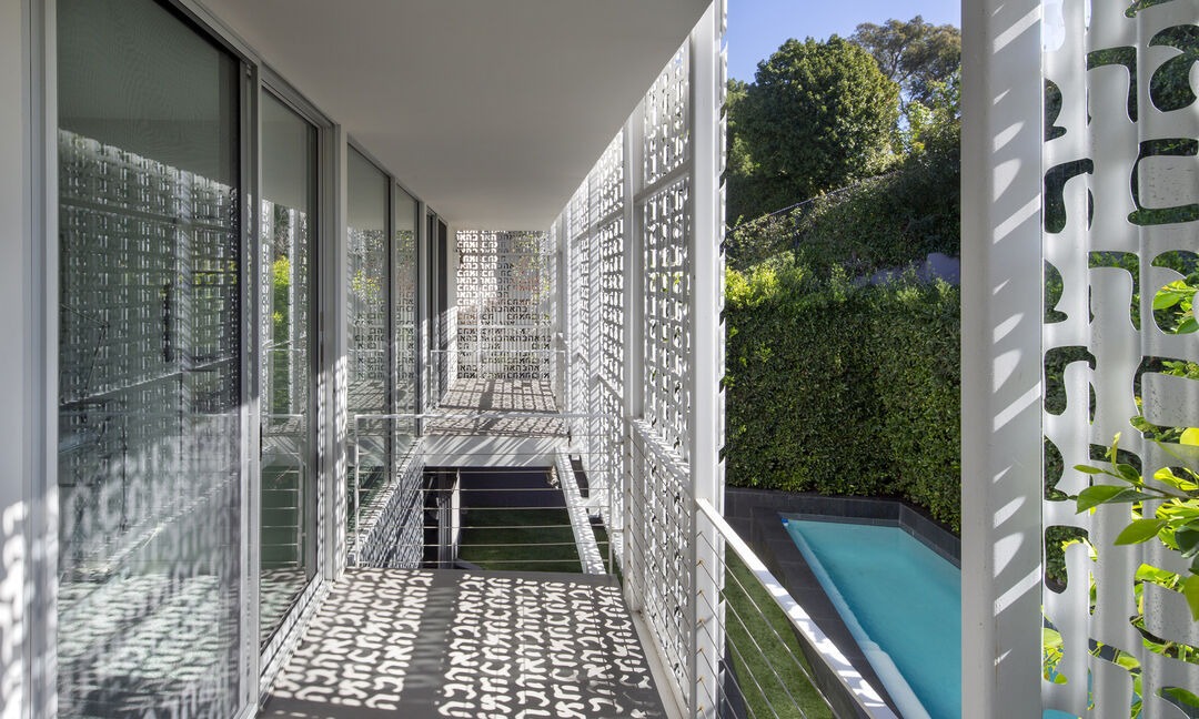 A stunning modern patio featuring a sleek turquoise pool framed by clean-lined white pergolas with geometric perforated screening that casts dramatic shadow patterns. The space integrates a lush vertical green living wall and is anchored by minimalist concrete flooring, creating a sophisticated indoor-outdoor luxury experience with abundant natural light.