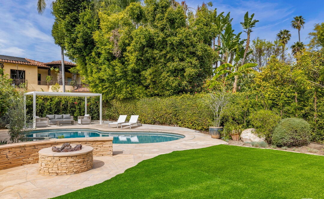 A stunning Southern California resort-style pool area featuring a kidney-shaped pool with natural stone patio, integrated stone fire pit, and a modern white pergola-covered lounge zone with upscale outdoor seating. The space is anchored by lush mature landscaping including hedges and palms, creating a serene, resort-quality outdoor retreat with seamless indoor-outdoor luxury living.