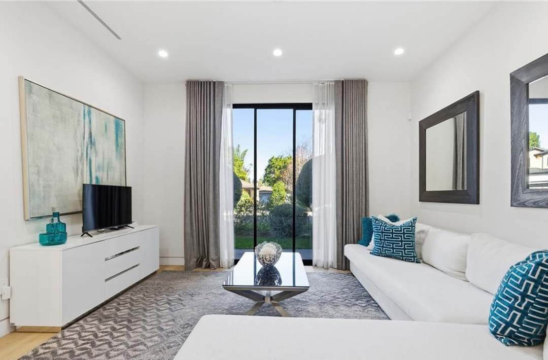 A sophisticated transitional family room featuring abundant natural light from floor-to-ceiling glass sliding doors opening onto manicured grounds, anchored by a clean-lined white sectional sofa accented with teal geometric pillows. The serene, airy space combines neutral base tones with modern furnishings and subtle cool accent colors, creating an elegant yet approachable retreat with excellent indoor-outdoor connectivity.