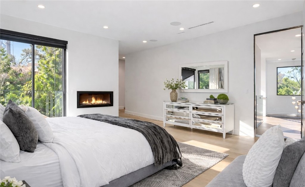 A stunning primary suite featuring a gas fireplace accent wall, abundant natural light from floor-to-ceiling windows with black frames, and a refined palette of whites, grays, and warm wood tones. The space balances contemporary minimalism with transitional touches like crown molding and custom millwork, creating a serene yet sophisticated luxury retreat.