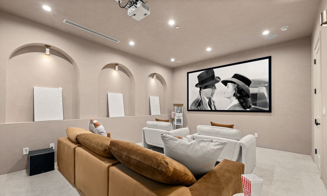 A luxurious home theater featuring a sophisticated palette of warm neutrals (beige, cream, tan) anchored by a rich cognac-toned suede sectional and complementary cream armchair seating. The space showcases refined architectural details including three arched alcoves with subtle brass pendant lighting, full-height wainscoting, and crown molding, creating an upscale transitional aesthetic that balances traditional elegance with contemporary comfort and a curated black-and-white cinema photograph as the focal point.