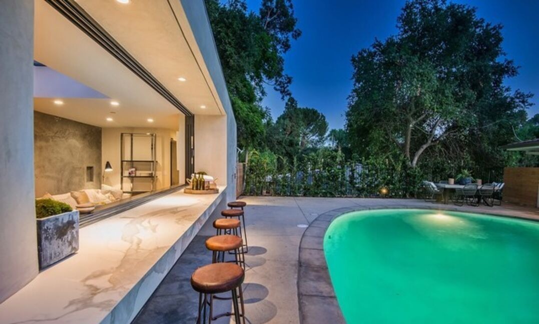 A stunning contemporary pool area seamlessly integrating luxury indoor-outdoor living with a marble-topped bar overlooking a resort-style pool illuminated in jewel-tone turquoise. The space exemplifies high-end desert modern design with clean architectural lines, organic landscaping, and sophisticated material choices that blur the boundary between interior comfort and outdoor entertainment.