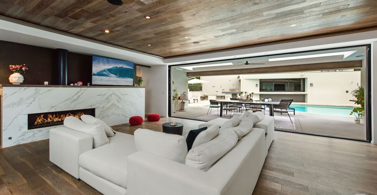 A stunning ultra-luxury living room with seamless indoor-outdoor flow, featuring a striking marble fireplace, warm wood plank ceiling, and elegant white sectional seating overlooking a resort-style pool and outdoor entertaining area. The space exemplifies contemporary organic modernism with warm neutrals, natural materials, and sophisticated furnishings that balance comfort with refined design.
