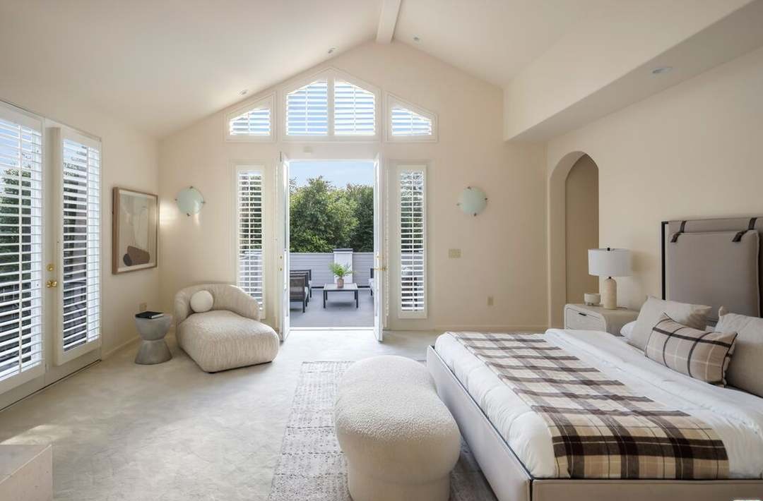 This expansive primary bedroom suite features a soaring vaulted ceiling with arched transoms and abundant natural light from floor-to-ceiling French doors opening to a private terrace. The serene, neutral palette of creams and taupes is anchored by organic textiles and simple black metal fixtures, creating a sophisticated yet restful sanctuary that seamlessly integrates indoor and outdoor living.