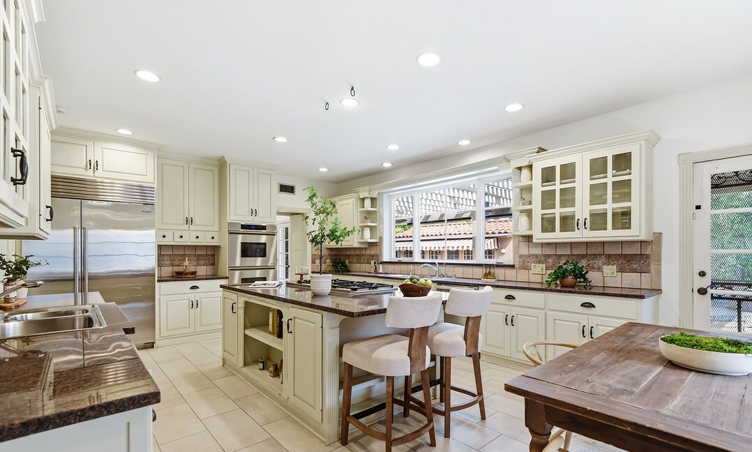 Island With SeatingCrown MoldingGlass Front CabinetsOpen ShelvingRecessed LightingDouble OvenStainless Steel AppliancesPot FillerHigh CeilingsAbundant WindowsBuilt In ShelvingCustom Millwork