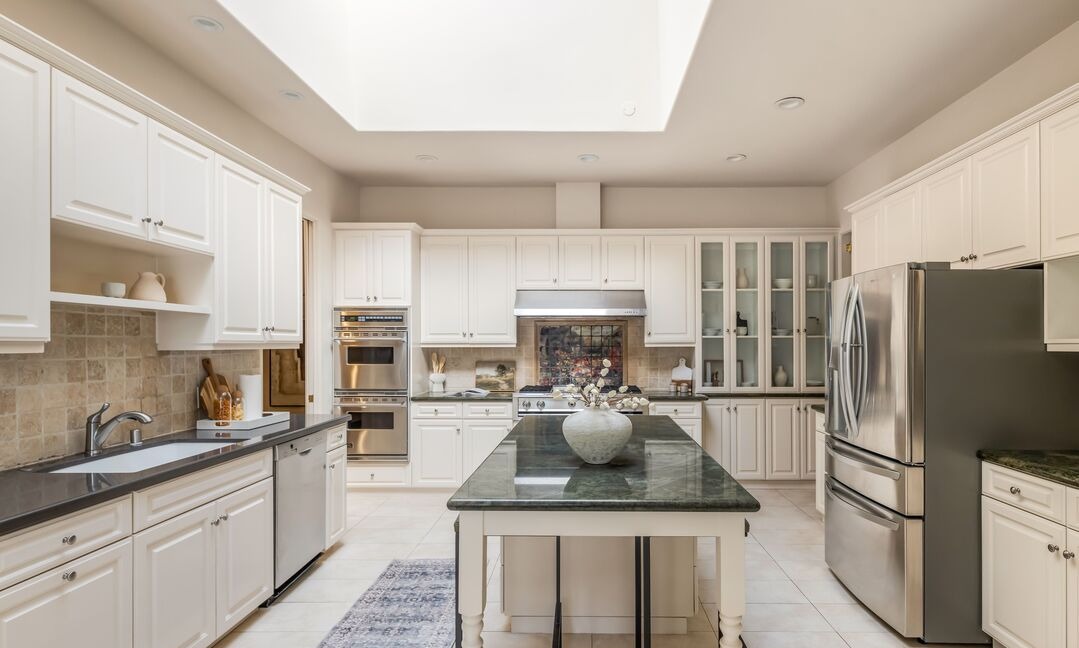 IslandWaterfall IslandRange HoodDouble OvenGlass Front CabinetsRecessed LightingSkylightsHigh CeilingsCrown MoldingCustom Millwork